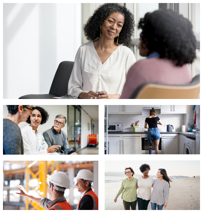 Our photography often features people of all races, in a middle-aged to older demographic. Most of our audience have disabilities that are not visible, but it's important to include some photos of physical impairments when appropriate. We try not to use images of people who appear overly excited or happy; instead, we prefer that they look inspired and hopeful.